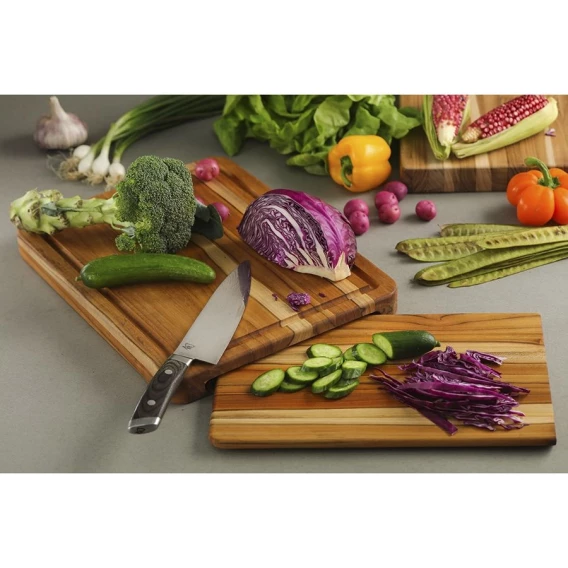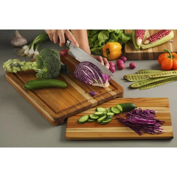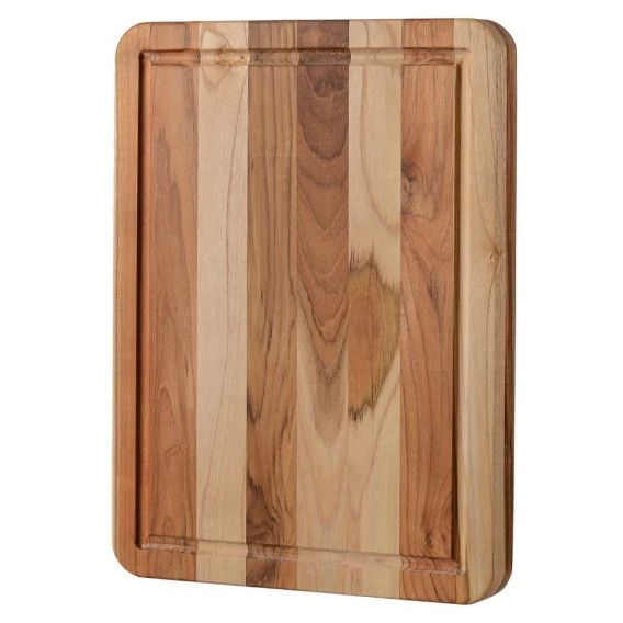 Набор из 2 разделочных досок Traditional станет незаменимым помощником на домашней и профессиональной кухне. Изделия с привлекательным дизайном и уникальным природным рисунком поможет увеличить поверхность для нарезания продуктов: сыра, овощей, фруктов, хлеба, мяса или рыбы. Массивные и увесистые доски выполнены из сертифицированной древесины тика, волокна которого направлены горизонтально. Материал достаточно твердый и прочный, поэтому изделия служат долго, а ножи не затупляются и не оставляют глубоких порезов. Доски обладают хорошими влагоотталкивающими свойствами, не деформируются и не впитывают сок от нарезаемых продуктов. Благодаря раздвижной конструкции изделия не занимают много места и их удобно хранить.Доску рекомендуется хранить на сухой поверхности в вертикальном положении, избегая попадания прямых солнечных лучей. Также следует периодически смазывать ее минеральным маслом, чтобы сохранить и продлить срок эксплуатации.Размер: 40,6x30,5x3,8 см