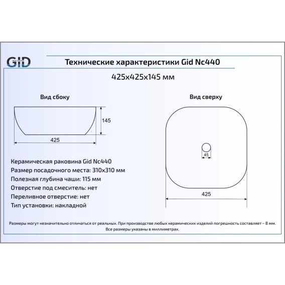 Раковина 42,5x42,5 см GID Color Edition Nc440