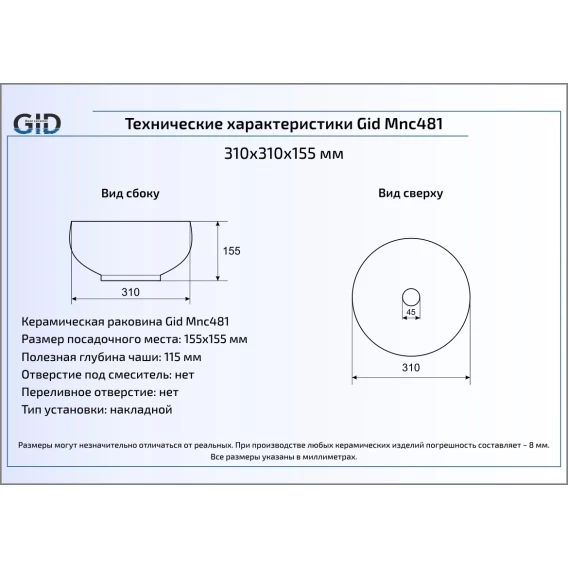 Раковина 45,5x32,5 см GID Stone Edition Mnc548