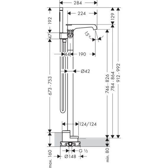 • состоит из: напольного термостата для ванны, ручного душа, душевого шланга, держателя для душа