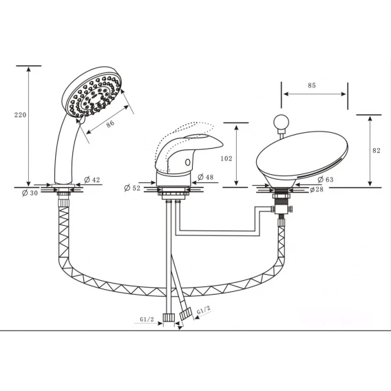 Крепление, Гибкая подводка, Душевой шланг, Душевая лейка
