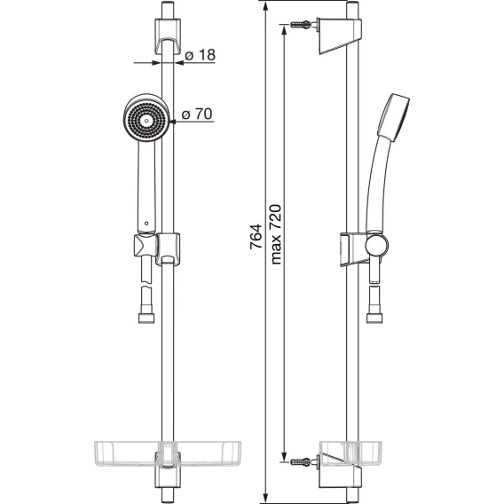 Душевой шланг, Душевая лейка, Держатель для душевой лейки, Мыльница, Штанга душевая