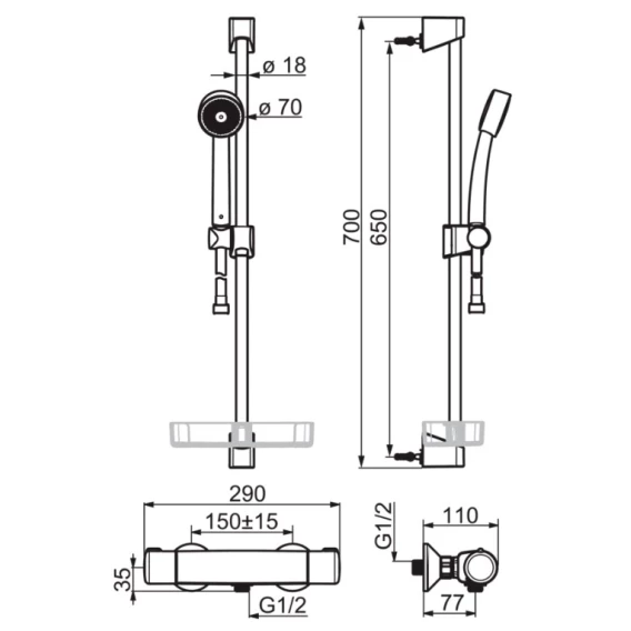 Металлическая розетка, Эксцентрики, Душевой шланг, Душевая лейка, Держатель для душевой лейки, Мыльница, Штанга душевая