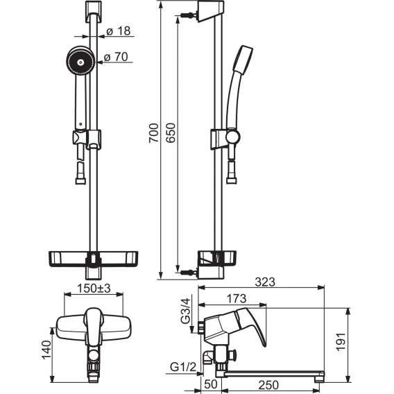 Аэратор, Душевой шланг, Душевая лейка, Держатель для душевой лейки, Мыльница, Штанга душевая