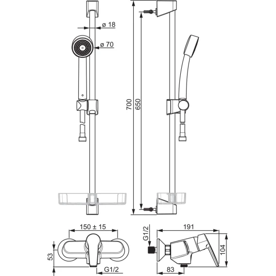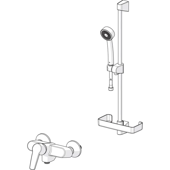 Металлическая розетка, Эксцентрики, Душевой шланг, Душевая лейка, Держатель для душевой лейки, Мыльница, Штанга душевая