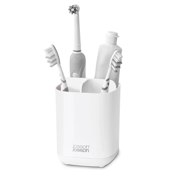 Эргономичный органайзер идеально подходит для хранения обычных и электрических зубных щеток, а также тюбиков пасты.В органайзере есть вентиляционные отверстия, позволяющие предметам быстро сохнуть. В контейнере не скапливается влага, он остается сухим и сохраняет все предметы в прекрасном состоянии. Аксессуар очень легко разбирается и моется, поэтому уход за ним не займет много времени. На дне органайзера есть специальные силиконовые ножки. Этот материал не скользит на гладких поверхностях, что придает органайзеру дополнительную устойчивость.