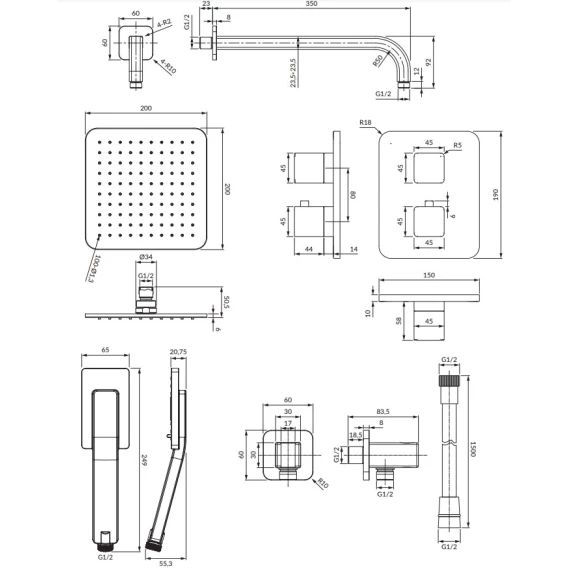 Душевой шланг, Душевая лейка, Подключение для душевого шланга с держателем, Верхний душ, Скрытая монтажная часть, Кронштейн, Термостат