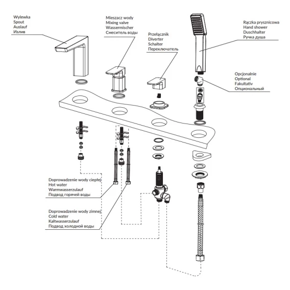 Крепление, Аэратор, Гибкая подводка, Душевой шланг, Душевая лейка
