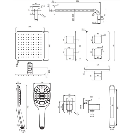 Душевой шланг, Душевая лейка, Подключение для душевого шланга с держателем, Верхний душ, Скрытая монтажная часть, Кронштейн, Термостат