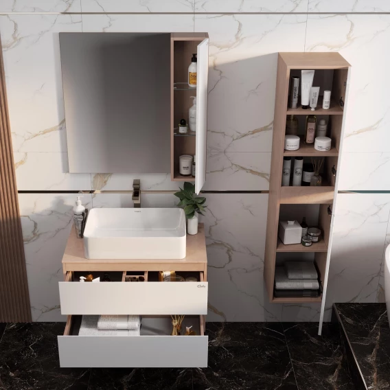 Подвесной шкаф пенал для ванной комнаты пенал Onika АЛЕСТА 35 отражает актуальные тенденции в дизайне мебели для ванной комнаты: минимализм и геометрия фасадов, белый глянец и текстура бетонного камня, отсутствие декора, скрытая встроенная ручка. Внутреннее пространство пенала поделено полками на 5 секций разной высоты, что позволяет удобно разместить все необходимые мелочи. Двери снабжены механизмом плавного закрывания. Ручки, изящно интегрированные в фасады, позволяют сделать эксплуатацию мебели более удобной и практичной. Пенал имеет универсальную ориентацию: при установке верх и низ пенала можно менять местами, а дверцы могут открываться как влево, так и вправо. Пенал надежно крепится к стене и не занимает место на полу, не создавая при этом сложностей в уборке помещения. Корпус пенала выполнен из ЛДСП, фасад - из МДФ, покрытой эмалью, устойчивых к механическим воздействиям, перепадам температур и высокой влажности. Подвесы для крепления пенала - в комплекте.