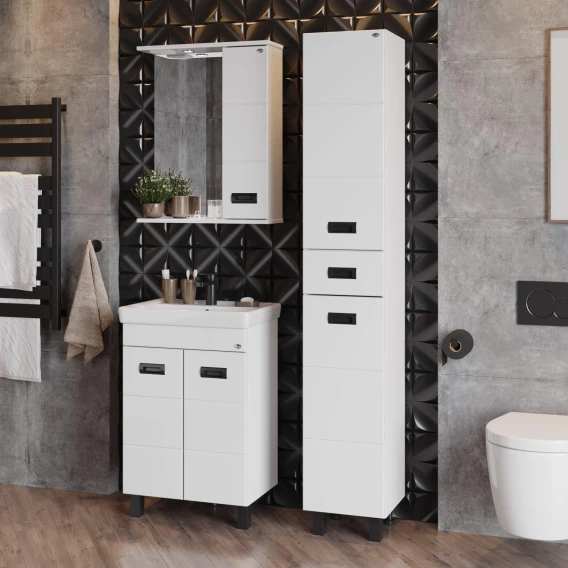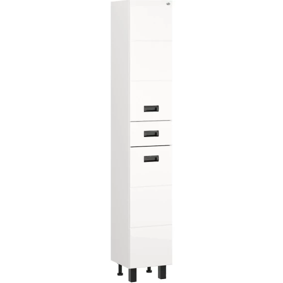 Напольный шкаф пенал для ванной комнаты Onika БАЛТИКА 32 Black - это простые функциональные формы и яркий акцент в любом дизайне. Глянцевый белый цвет фасада контрастирует с черной матовой фурнитурой, а ненавязчивая горизонтальная фрезеровка дополняет образ стильной и современной мебели. Удобный ящик с направляющими полного выдвижения посередине пенала и два больших отделения, разделенные горизонтальными полочками, за распашными дверями с механизмом плавного закрывания - отличное место для хранения необходимых вещей. Пенал имеет универсальную ориентацию: при установке верх и низ пенала можно менять местами, а дверцы могут открываться как влево, так и вправо. Корпус пенала выполнен из ЛДСП, фасад - из МДФ в пленке, устойчивых к механическим воздействиям, перепадам температур и высокой влажности. 2 декоративных и 2 пластиковых ножки с регулировкой по высоте идут в комплекте с пеналом.