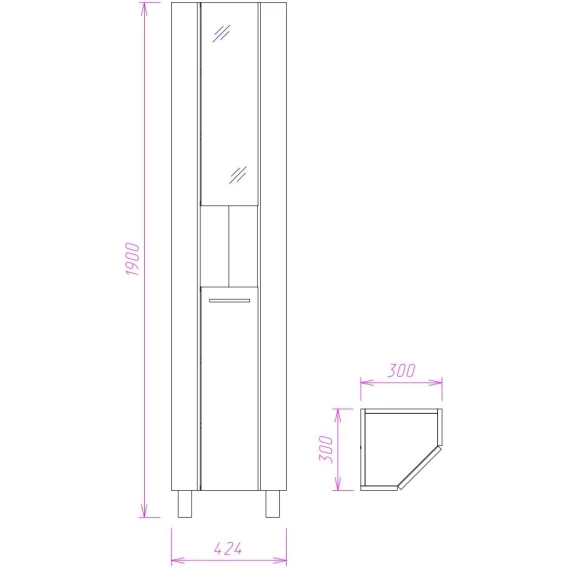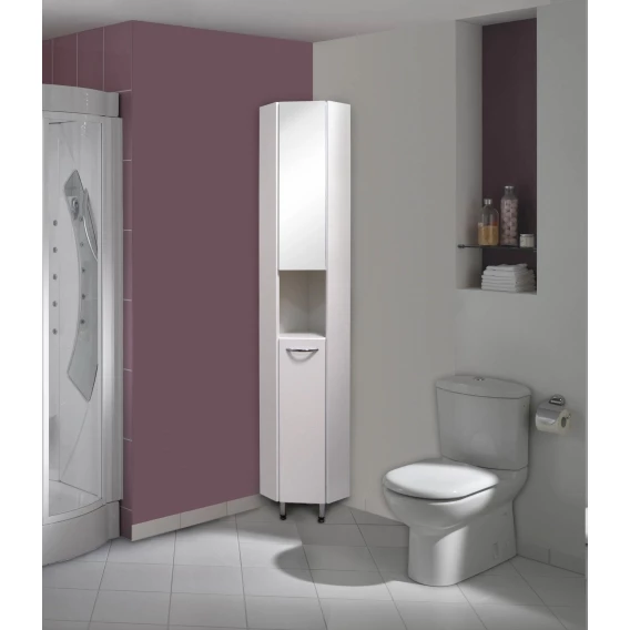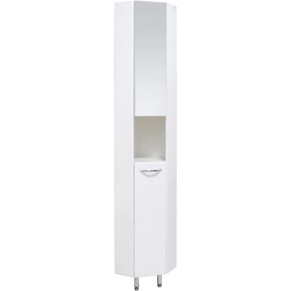 Напольный угловой шкаф пенал с зеркалом для ванной комнаты Onika ДЮНА 30 - настоящая находка для компактной ванной комнаты: он значительно экономит место без потери функциональности. Белая глянцевая поверхность, простая узкая ручка и минималистичный дизайн подойдет к любому интерьеру, а открытая полка посередине и два больших отделения за распашными дверями (верхняя дверь является зеркалом!) - отличное место для хранения необходимых вещей. Корпус пенала выполнен из ЛДСП, фасад - из МДФ в пленке, устойчивых к механическим воздействиям, перепадам температур и высокой влажности. 2 декоративных и 1 пластиковая ножки с регулировкой по высоте, а так же хромированная ручка идут в комплекте с пеналом.