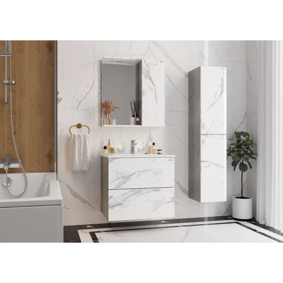Подвесной пенал для ванной комнаты Onika МАРБЛ 30 станет стильным и функциональным элементом пространства современной ванной комнаты. Спроектированный дизайнерами в минималистичном облике, пенал отражает самые актуальные расцветки сезона - бетон и мрамор. Внутреннее пространство пенала поделено полками на 4 секции, что позволяет разместить косметические различные косметические средства. Дверь снабжена механизмом плавного закрывания. Пенал имеет универсальную ориентацию: при установке верх и низ пенала можно менять местами, а дверцы могут открываться как влево, так и вправо. Корпус пенала выполнен из ЛДСП, фасады ящиков - из МДФ в пленке, устойчивых к механическим воздействиям, перепадам температур и высокой влажности. Пенал надежно крепится к стене и не занимает место на полу, не создавая при этом сложностей в уборке помещения. Подвесы для крепления пенала и 2 белые матовые ручки - в комплекте.