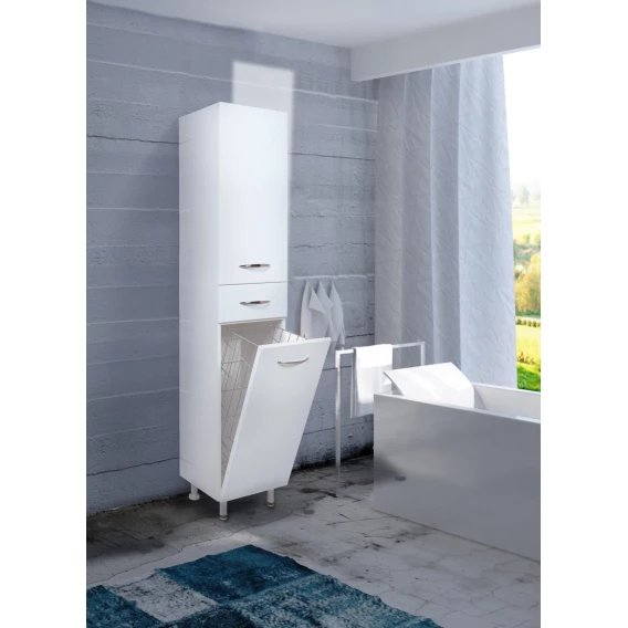 Напольный пенал для ванной комнаты с корзиной для белья Onika МОДЕРН 26, благодаря простому минималистичному дизайну, белому глянцевому фасаду, подойдет под любой интерьер ванной комнаты. Большое отделение сверху за распашной дверцей с механизмом плавного закрывания, небольшой ящик с направляющими полного выдвижения посередине и отделение с корзиной для белья внизу шкафа обеспечит бережное хранение всех необходимых в ванной комнате вещей. Размер бельевой корзины: 180*240*650. Корпус пенала выполнен из ЛДСП, фасад - из МДФ в пленке, специально предназначенных для использования в условиях высокой влажности. В комплекте - 3 хромированные ручки и 4 ножки: 2 декоративные и 2 пластиковые.