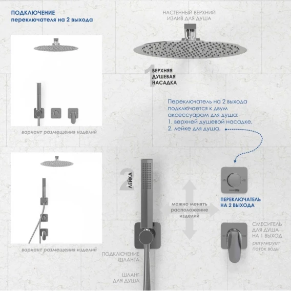 • Подключается к двум аксессуарам для душа на выбор: верхней душевой насадке, лейке для душа и настенному изливу