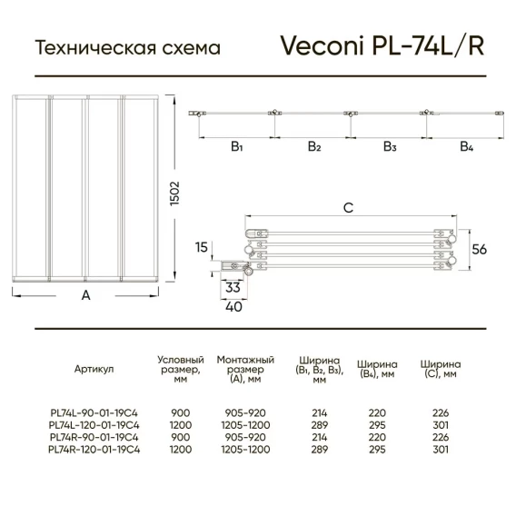 Шторка для ванны 120 см Veconi Palau PL74L-120-01-19C4 прозрачное
