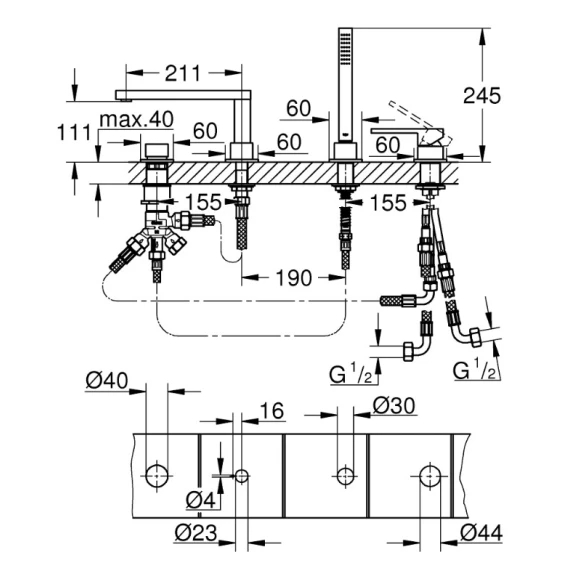 Крепление, Аэратор, Гибкая подводка, Душевой шланг, Душевая лейка