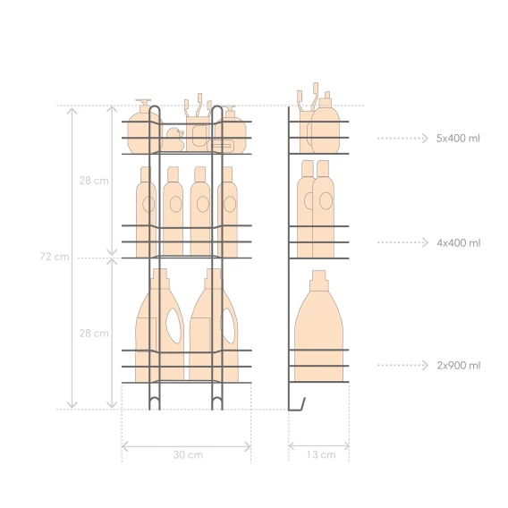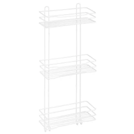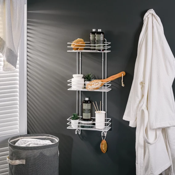 Трёхъярусная прямая полка с крючками из стали имеет размеры: ширина 30 см, длина 13 см, высота 72 см . Аксессуар изготовлен из прочного металла с устойчивым покрытием: краска белого цвета. Полимерное покрытие обеспечивает повышенную стойкость к коррозии, обладает повышенной стойкостью к щелочам, входящим в состав косметических средств и бытовой химии, благодаря чему,полка прослужит долго. Идёт в комплекте с шурупами из нержавеющей стали. Полка легко крепится к стене, легко моется, надолго сохраняет декоративные и эксплуатационные свойства.Благодаря прочному сплаву, надёжному крепёжу изделие выдерживает большую нагрузку . Усиленный пруток препятствует деформации в процессе эксплуатации. Аккуратно обработанные края и швы облегчают уход. Вместительные полки позволяют разместить разнообразные предметы, как крупного, так и мелкого размера. Высокий бортик препятствует выпадению содержимого. Дно из проволоки не удерживает жидкость..Полка также оснащена двумя крючками, которые можно использовать для полотенец и мочалок Такой аксессуар позволит не только украсить ванную комнату, но и эргономично использовать доступное пространство.