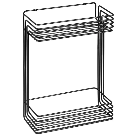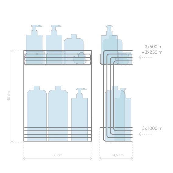 Настенная двухъярусная прямая полка имеет размеры: высота 30 см, длина 14,4 см, ширина 40 см. Изделие выполнено из прочного металла с устойчивым полимерным покрытием – краской чёрного цвета. Благодаря специальным добавкам покрытие устойчиво к щелочам в составе косметических средств и бытовой химии. Полка идёт в комплекте с оцинкованными саморезами в цвет изделия. Увеличенный промежуток между ярусами позволяет разместить высокие бутылочки. Расстояние между полками - 33,6 см. Расстояние между креплениями- 18 см. Надежный крепёж выдерживает большую нагрузку. Аккуратно обработанные края и швы облегчают уход. Высокий бортик препятствует выпадению содержимого. Гарантия изделия составляет 1 год.