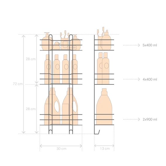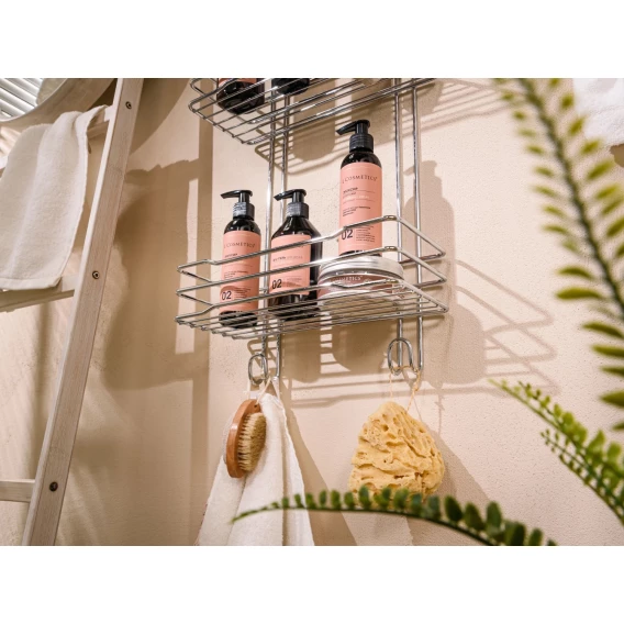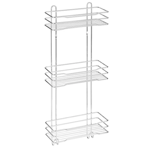 Трёхъярусная прямая полка с крючками из стали с гальваническим покрытием цвета хром. Размеры изделия: высота 72 см, длина 13 см, ширина 30 см. Идёт в комплекте с шурупами из нержавеющей стали. Отлично подойдет для хранения банных принадлежностей, таких, как мочалки, флаконы, мыло и др. Надёжный крепёж и толстый пруток (2,8 и 5 мм) выдерживает большую нагрузку. Гальваническое покрытие обеспечивает повышенную стойкость к коррозии, благодаря чему полка прослужит долго. Покрытие обладает повышенной стойкостью к щелочам, входящим в состав косметических средств и бытовой химии. Изделие долго сохраняет первозданный вид. Аккуратно обработанные края и швы облегчают уход. Увеличенный промежуток между ярусами и вместительные полки позволяют разместить высокие бутылочки и предметы, как крупного, так и мелкого размера. Высокий бортик препятствует выпадению содержимого. Дно из проволоки не удерживает жидкость. Полка также оснащена двумя крючками, которые можно использовать для полотенец и мочалок. Универсальный цвет. Такой аксессуар позволит не только украсить ванную комнату, но и эргономично использовать доступное пространство.