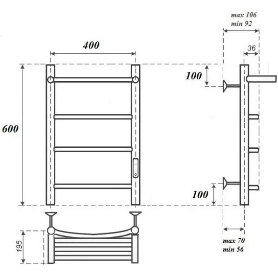 Полотенцесушитель электрический APEXTERMO Corona CR01164BM 600x432, диммер правый, черный матовый