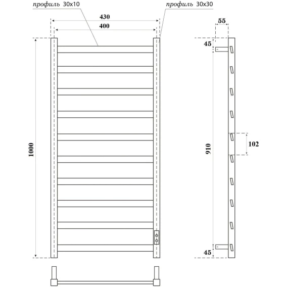 Полотенцесушитель электрический APEXTERMO Galaxy GL00104BM 1000x430, диммер правый, черный матовый