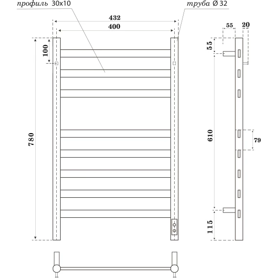 Полотенцесушитель электрический APEXTERMO Sfera SF10184BM 780x432, диммер правый, черный матовый