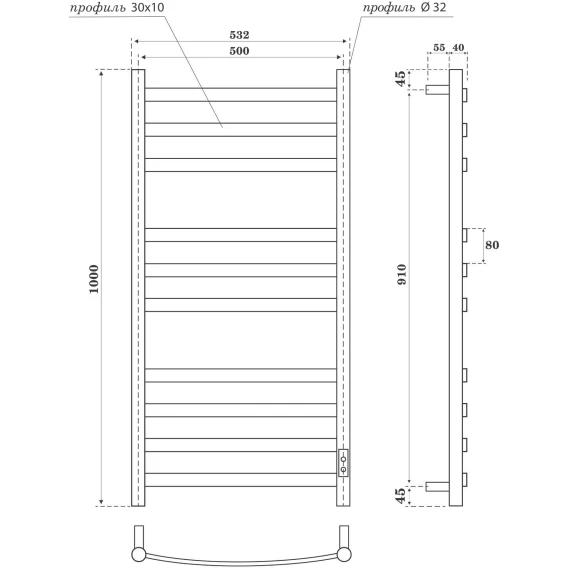 Полотенцесушитель электрический APEXTERMO Umbra UM00105WM 1000x532, диммер правый, белый матовый