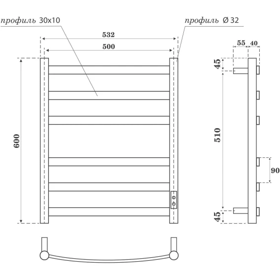 Полотенцесушитель электрический APEXTERMO Umbra UM00165WM 600x532, диммер правый, белый матовый