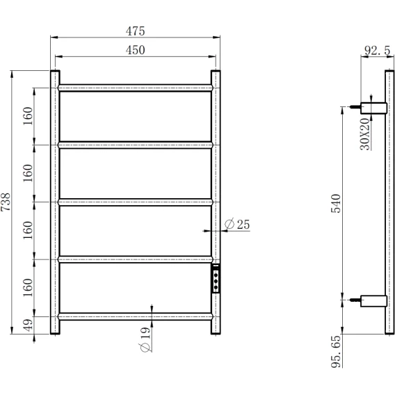 Полотенцесушитель электрический AQUAme AQM3125BG 738x475, диммер правый, золотой матовый