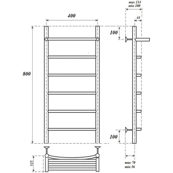 Полотенцесушитель - 1 шт, кронштейны для крепления к стене - 4 шт, кран Маевского - 1 шт, заглушка декоративная - 1 шт, Электротэн – 1 шт, паспорт/гарантийный талон - 1 шт
