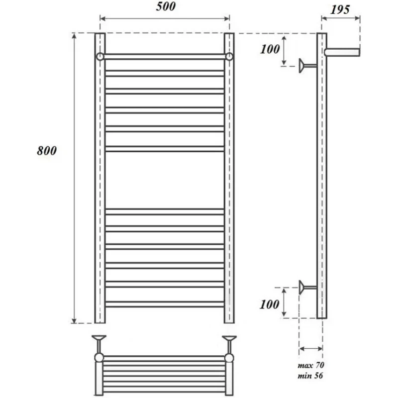 Полотенцесушитель - 1 шт, кронштейны для крепления к стене - 4 шт, кран Маевского - 1 шт, заглушка декоративная - 1 шт, Электротэн – 1 шт, паспорт/гарантийный талон - 1 шт