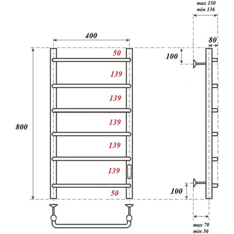 Полотенцесушитель - 1 шт, кронштейны для крепления к стене - 4 шт, сетевой кабель - 1 шт, комплект скрытого подключения - 1 шт, паспорт/гарантийный талон - 1 шт
