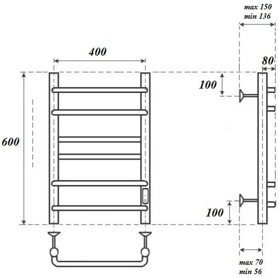 Полотенцесушитель - 1 шт, кронштейны для крепления к стене - 3 шт, сетевой кабель - 1 шт, комплект скрытого подключения - 1 шт, паспорт/гарантийный талон - 1 шт