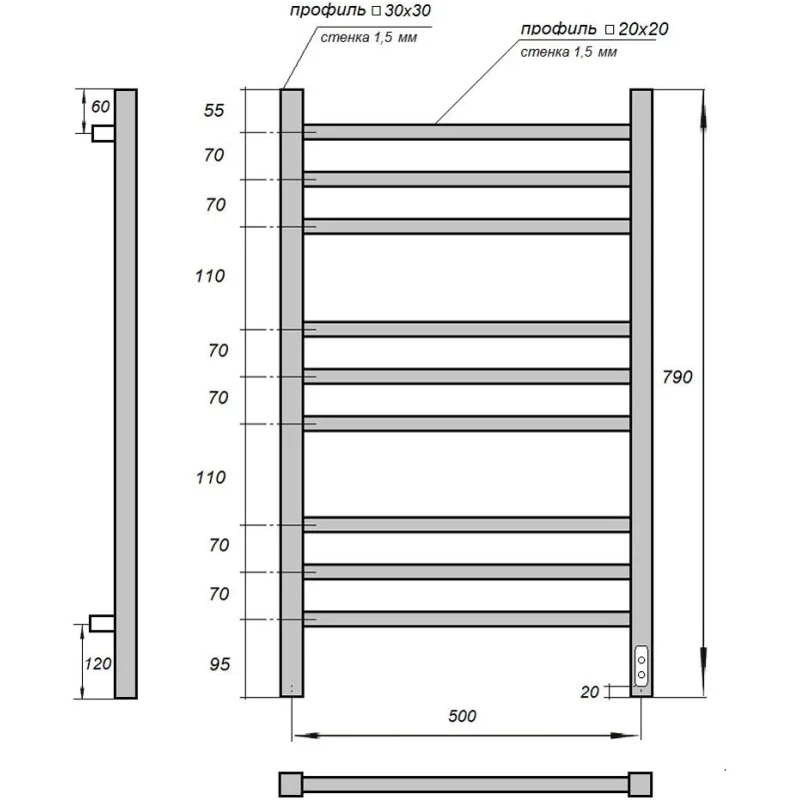 Полотенцесушитель - 1 шт, кронштейны для крепления к стене - 4 шт, сетевой кабель - 1 шт, комплект скрытого подключения - 1 шт, паспорт/гарантийный талон - 1 шт