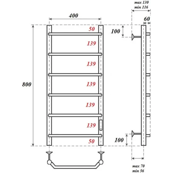 Полотенцесушитель - 1 шт, кронштейны для крепления к стене - 4 шт, сетевой кабель - 1 шт, комплект скрытого подключения - 1 шт, паспорт/гарантийный талон - 1 шт