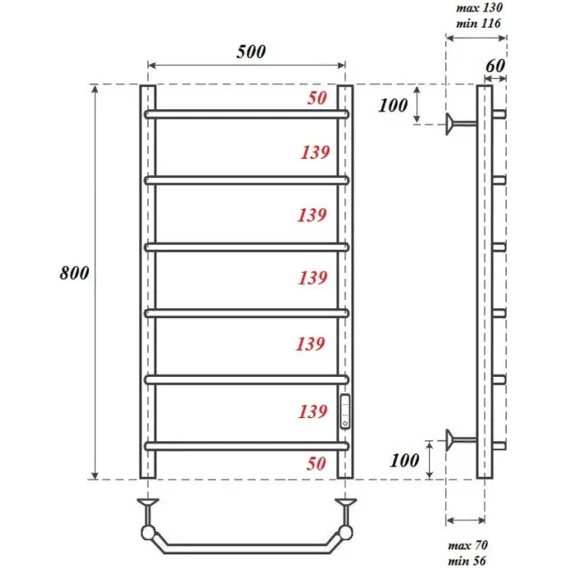 Полотенцесушитель - 1 шт, кронштейны для крепления к стене - 4 шт, сетевой кабель - 1 шт, комплект скрытого подключения - 1 шт, паспорт/гарантийный талон - 1 шт
