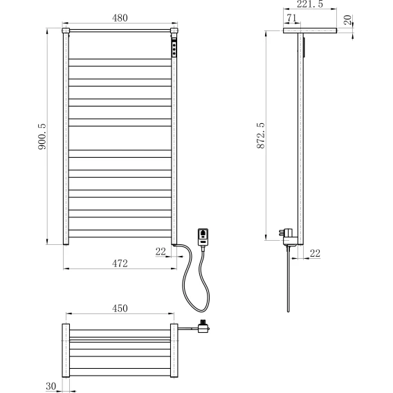 Полотенцесушитель электрический Wonzon & Woghand Frankfurt WW-A1029-MB 900,5x480, МЭМ правый, черный матовый