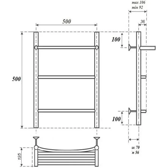 Полотенцесушитель - 1 шт, кронштейны для крепления к стене - 4 шт, кран Маевского - 1 шт, заглушка декоративная - 1 шт, паспорт/гарантийный талон - 1 шт