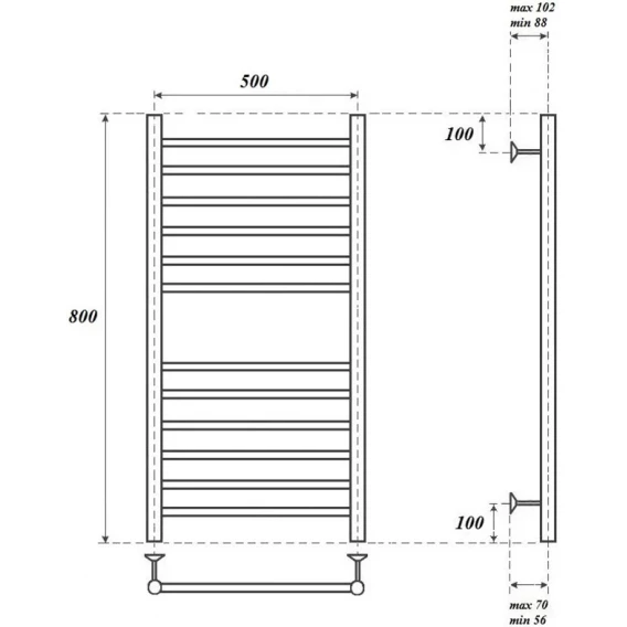 Полотенцесушитель - 1 шт, кронштейны для крепления к стене - 4 шт, кран Маевского - 1 шт, заглушка декоративная - 1 шт, паспорт/гарантийный талон - 1 шт