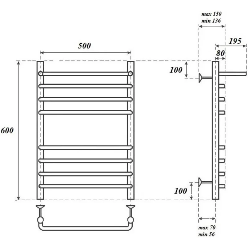 Полотенцесушитель - 1 шт, кронштейны для крепления к стене - 4 шт, кран Маевского - 1 шт, заглушка декоративная - 1 шт, паспорт/гарантийный талон - 1 шт