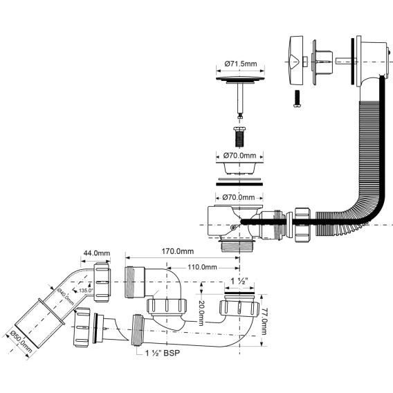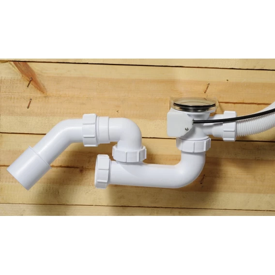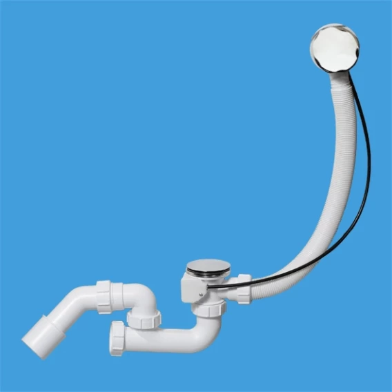 Трап (1 1/2'х40мм) с ревизией для ванн с автопереливом (L575ммхD34мм), пластиковой поворотной головкой, нержавеющими 70мм сливной решеткой и пробкой; выход Дн=40/50мм; цвет-хром