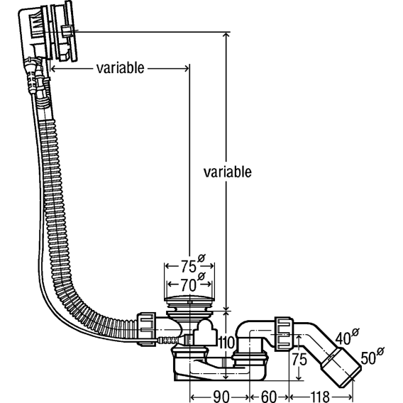 гибкая переливная труба, хромированная поворотная розетка, хромированная сливная пробка, сифон, сливное колено 45°, клапан из нержавеющей стали