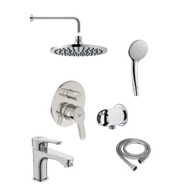 Аэратор, Гибкая подводка, Донный клапан, Душевой шланг, Душевая лейка, Держатель для душевой лейки, Подключение для душевого шланга с держателем, Верхний душ, Смеситель, Кронштейн