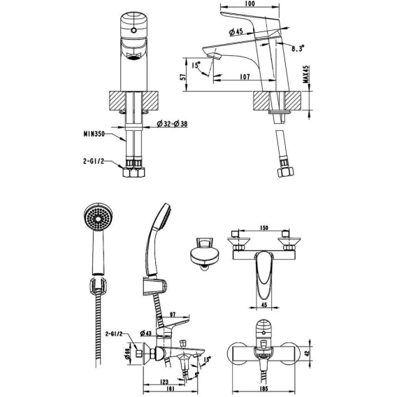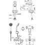 Крепление, Аэратор, Гибкая подводка, Металлическая розетка, Эксцентрики, Душевой шланг, Душевая лейка, Держатель для душевой лейки, Смеситель, Мыльница, Штанга душевая