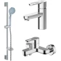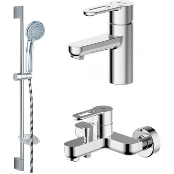 Крепление, Аэратор, Гибкая подводка, Металлическая розетка, Эксцентрики, Душевой шланг, Душевая лейка, Держатель для душевой лейки, Смеситель, Мыльница, Штанга душевая