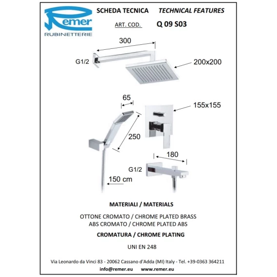 Душевой комплект 200 мм Remer Qubika Q09S03