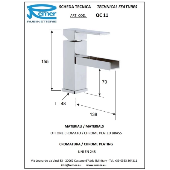 Смеситель для раковины без донного клапана Remer Qubika Cascata QC11