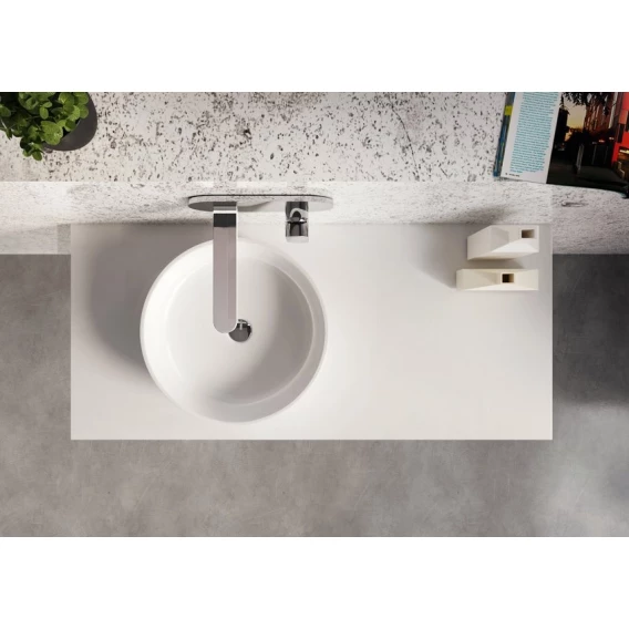Авторский умывальник изготовленный из литого мрамора, дизайн которого основан на элементарной геометрической форме круга. Идеально сбалансирует в ванной комнате элементы прямоугольной формы, такие как плитка душевого уголка или мебель. Подходит для установки на столешницу.