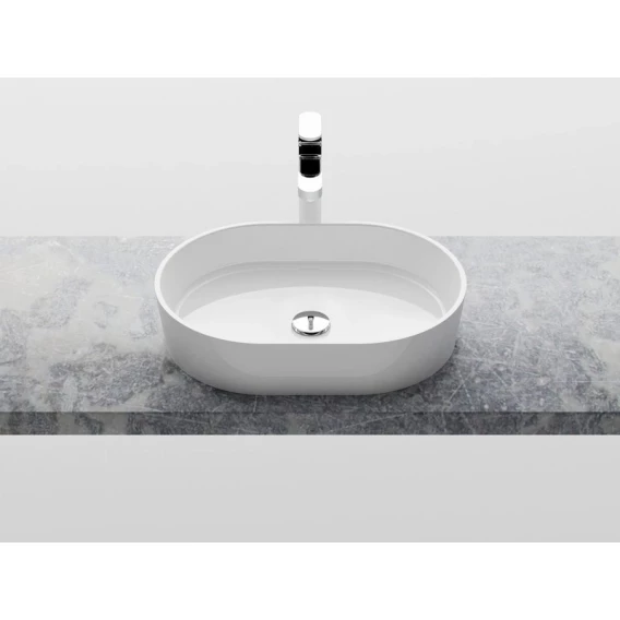 Авторский умывальник изготовленный из литого мрамора, дизайн которого основан на элементарной геометрической форме круга, который дизайнер трансформировал в практичный овал. Комфортная ширина для каждодневного использования. Идеально сбалансирует в ванной комнате элементы прямоугольной формы, такие как плитка душевого уголка или мебель. Подходит для установки на столешницу.